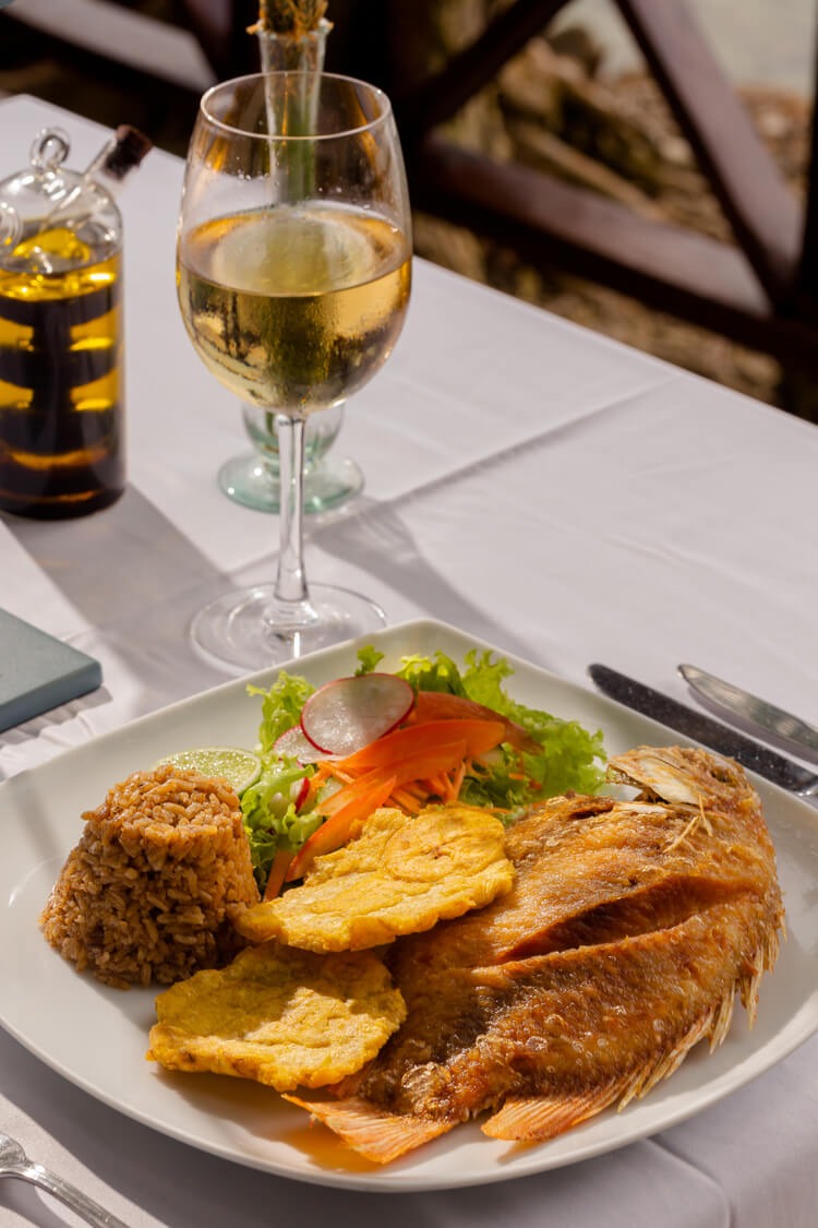 - Almuerzo según plan escogido con una entrada de chips de plátanos con hogao criollo o suero costeño más el fuerte seleccionado (pescado entero o langosta o parrillada de mariscos) más postre (dulces típicos) más bebida (agua o natural o limonada natural o jugo o gaseosa o cerveza nacional) más café colombiano o té.